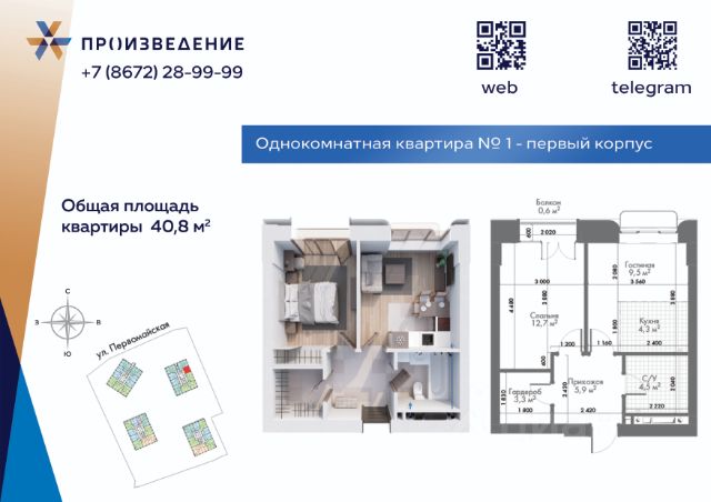 Продаётся 1 - комнатная квартира площадью 40,2м² на 2этаже. Квартира расположена в жилом комплексе бизнес-класса "Произведение на Первомайской", который представляет собой современный проект, состоящий из четырех 17-этажных корпусов. Строительство ведется по монолитной технологии с применением передовых инженерных решений, обеспечивающих повышенную сейсмоустойчивость зданий. В проекте представлены разнообразные типы квартир: от 1-комнатных до 4+ комнатных. Площадь квартир варьируется в диапазоне от 40,8 м² до 262 м². Высота потолков в помещениях составляет от 3 метра. Ключевой особенностью проекта являются свободные планировки, которые дают полную свободу для создания любого жизненного сценария. А также есть отделка White Box, что позволит будущим жильцам сразу приступить к реализации собственного дизайн-проекта. Среди нестандартных форматов жилья предусмотрены двухуровневые пентхаусы и квартиры с просторными террасами. Комфорт и безопасность Для комфорта и безопасности жителей в ЖК "Произведение на Первомайской" реализована многоуровневая система защиты. Территория комплекса полностью закрыта от посторонних и свободна от автомобилей, что создает безопасную среду для прогулок. По всему периметру ведется круглосуточное видеонаблюдение, а доступ осуществляется по цифровым ключам. В каждом подъезде установлены пассажирские и грузовые лифты. Для автовладельцев предусмотрен подземный паркинг с прямым доступом на лифте на жилой этаж. Для удобства жителей оборудованы колясочные, велопарковки и индивидуальные кладовые помещения. В лобби круглосуточно дежурит профессиональный консьерж-сервис. Архитектура Архитектурная концепция ЖК "Произведение на Первомайской" разработана с целью создания нового, современного облика городской среды Владикавказа. Форма зданий отличается лаконичностью и чистотой линий. В отделке фасадов используется премиальный материал нового поколения — архитектурный стеклофибробетон. Этот прочный, долговечный и эстетичный материал, применяемый в знаковых мировых объектах, обеспечивает не только уникальный внешний вид, но и сохранение его на десятилетия. Панорамное остекление и французские балконы наполняют квартиры светом и воздухом, создавая ощущение простора. Благоустройство Благоустройство территории ЖК "Произведение на Первомайской" представляет собой полноценную экосистему для жизни и отдыха. Ландшафтный дизайн выполнен с использованием геопластики, создавая разноуровневое озелененное пространство с зонами для тихого отдыха, такими как "секретный сад". На территории обустроены современные детские игровые комплексы с безопасным покрытием и многофункциональные спортивные площадки. Уникальными элементами инфраструктуры являются собственный коворкинг, мужские и женские творческие мастерские, соседский центр (хадзар) и дворовой амфитеатр для проведения мероприятий. Окружение и досуг Жилой комплекс "Произведение на Первомайской" расположен в районе с развитой социальной и досуговой инфраструктурой. В радиусе 1015 минутной пешей доступнос