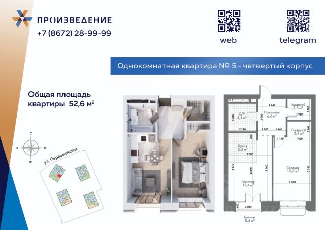 Продаётся 1 - комнатная квартира площадью 52м² на 2этаже. Квартира расположена в жилом комплексе бизнес-класса "Произведение на Первомайской", который представляет собой современный проект, состоящий из четырех 17-этажных корпусов. Строительство ведется по монолитной технологии с применением передовых инженерных решений, обеспечивающих повышенную сейсмоустойчивость зданий. В проекте представлены разнообразные типы квартир: от 1-комнатных до 4+ комнатных. Площадь квартир варьируется в диапазоне от 40,8 м² до 262 м². Высота потолков в помещениях составляет от 3 метра. Ключевой особенностью проекта являются свободные планировки, которые дают полную свободу для создания любого жизненного сценария. А также есть отделка White Box, что позволит будущим жильцам сразу приступить к реализации собственного дизайн-проекта. Среди нестандартных форматов жилья предусмотрены двухуровневые пентхаусы и квартиры с просторными террасами. Комфорт и безопасность Для комфорта и безопасности жителей в ЖК "Произведение на Первомайской" реализована многоуровневая система защиты. Территория комплекса полностью закрыта от посторонних и свободна от автомобилей, что создает безопасную среду для прогулок. По всему периметру ведется круглосуточное видеонаблюдение, а доступ осуществляется по цифровым ключам. В каждом подъезде установлены пассажирские и грузовые лифты. Для автовладельцев предусмотрен подземный паркинг с прямым доступом на лифте на жилой этаж. Для удобства жителей оборудованы колясочные, велопарковки и индивидуальные кладовые помещения. В лобби круглосуточно дежурит профессиональный консьерж-сервис. Архитектура Архитектурная концепция ЖК "Произведение на Первомайской" разработана с целью создания нового, современного облика городской среды Владикавказа. Форма зданий отличается лаконичностью и чистотой линий. В отделке фасадов используется премиальный материал нового поколения — архитектурный стеклофибробетон. Этот прочный, долговечный и эстетичный материал, применяемый в знаковых мировых объектах, обеспечивает не только уникальный внешний вид, но и сохранение его на десятилетия. Панорамное остекление и французские балконы наполняют квартиры светом и воздухом, создавая ощущение простора. Благоустройство Благоустройство территории ЖК "Произведение на Первомайской" представляет собой полноценную экосистему для жизни и отдыха. Ландшафтный дизайн выполнен с использованием геопластики, создавая разноуровневое озелененное пространство с зонами для тихого отдыха, такими как "секретный сад". На территории обустроены современные детские игровые комплексы с безопасным покрытием и многофункциональные спортивные площадки. Уникальными элементами инфраструктуры являются собственный коворкинг, мужские и женские творческие мастерские, соседский центр (хадзар) и дворовой амфитеатр для проведения мероприятий. Окружение и досуг Жилой комплекс "Произведение на Первомайской" расположен в районе с развитой социальной и досуговой инфраструктурой. В радиусе 1015 минутной пешей доступности