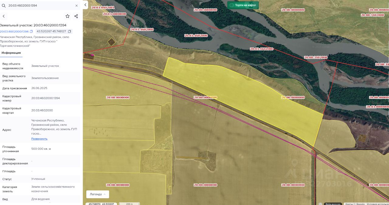 Земельный участок с кадастровым номером: 20:03:4602000:1394 площадью 500000 кв.м. расположенный по адресу: Чеченская Республика, Грозненский муниципальный район, с. Правобережное