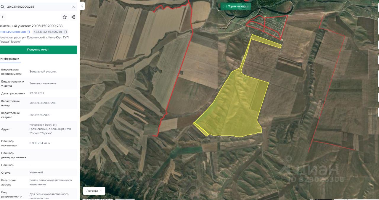 Земельный участок с кадастровым номером: 20:03:4502000:288 площадью 8936764 кв.м. расположенный по адресу: Чеченская Республика, Грозненский муниципальный район, с. Кень-Юрт