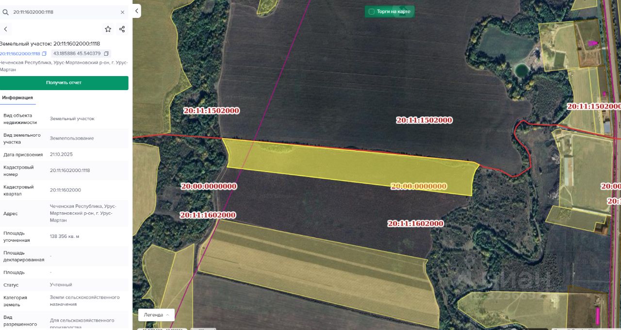 Земельный участок с кадастровым номером: 20:11:1602000:1118 площадью 138356 кв.м. расположенный по адресу: Чеченская Республика, Урус-Мартановский муниципальный район, г. Урус-Мартан
