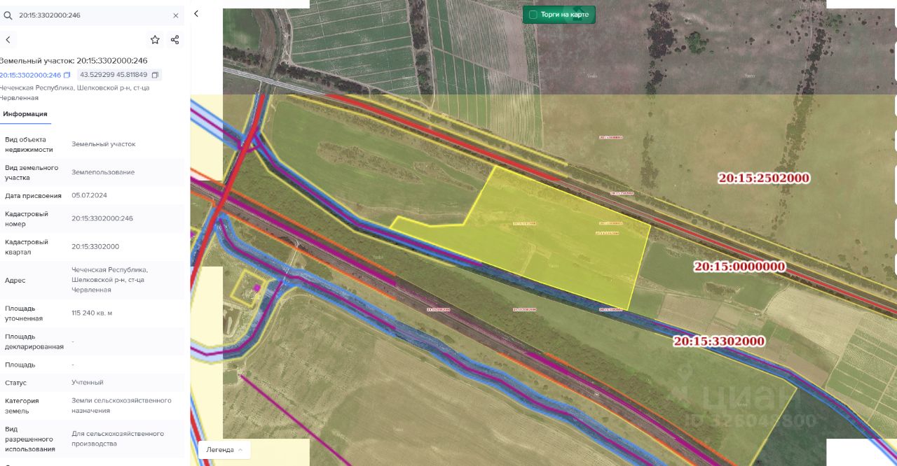 Земельный участок с кадастровым номером: 20:15:3302000:246 площадью 115240 кв.м. расположенный по адресу: Чеченская Республика, Шелковской муниципальный район, ст-ца Червленная