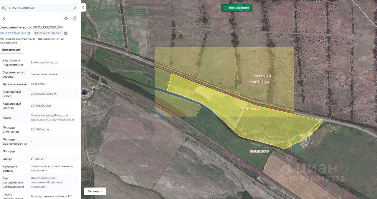 Земельный участок с кадастровым номером: 20:15:3302000:244 площадью 651900 кв.м. расположенный по адресу: Чеченская Республика, Шелковской муниципальный район, ст-ца Червленная