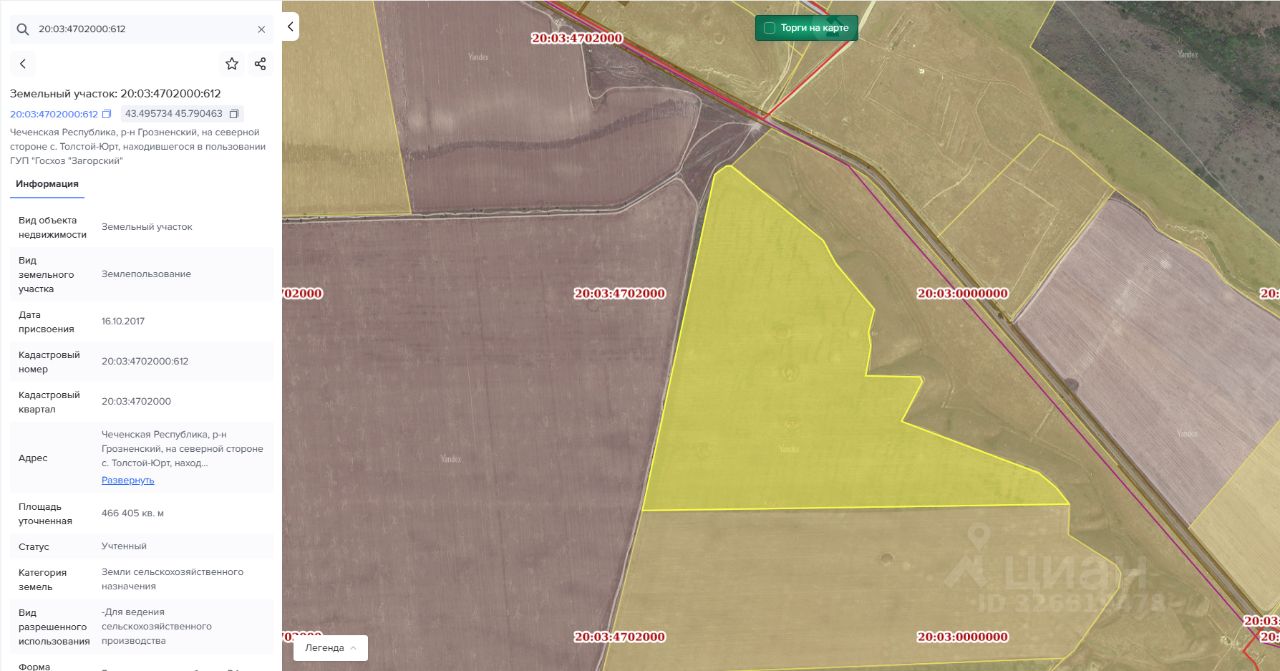 Земельный участок с кадастровым номером: 20:03:4702000:612 площадью 466405 кв.м. расположенный по адресу: Чеченская Республика, Грозненский муниципальный район, с. Толстой-Юрт