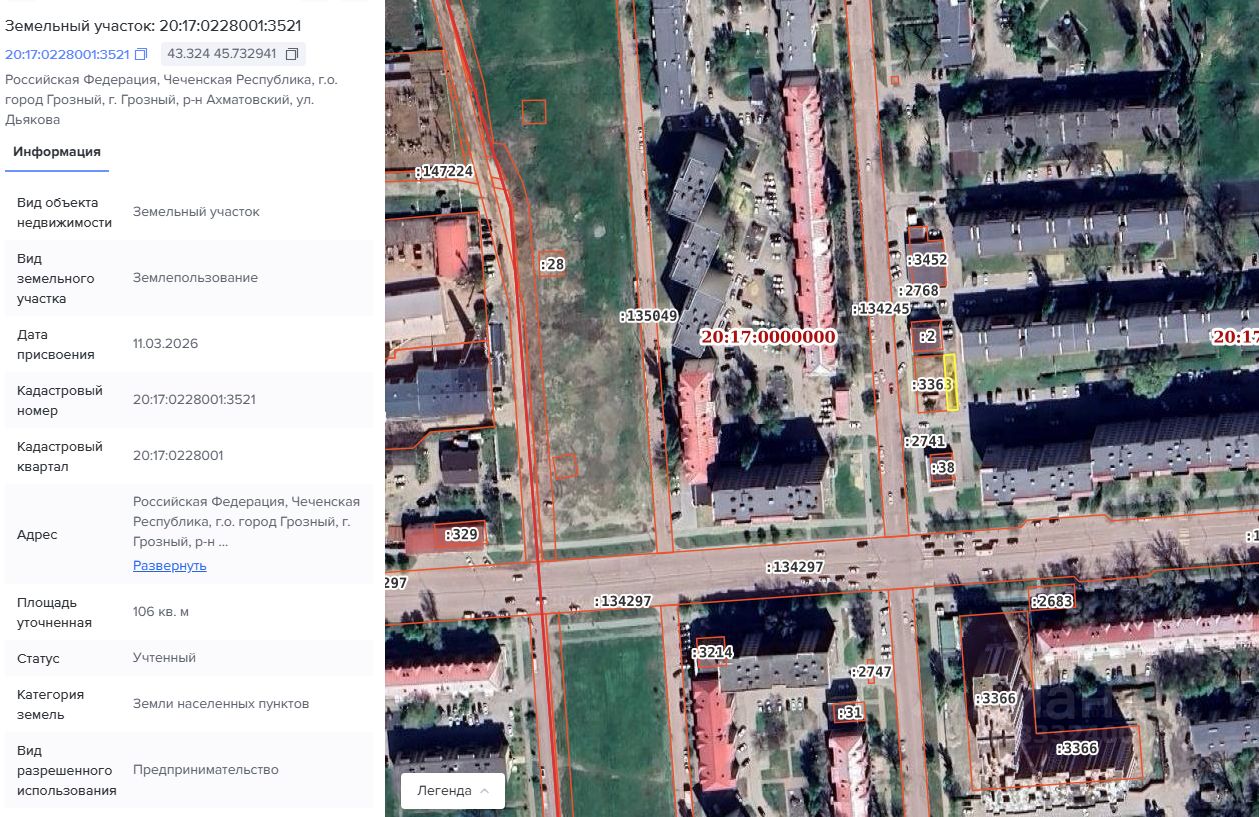 ЧР, г. Грозный, Ахматовский район, ул. Дьякова, б/н, кадастровый 20:17:0228001:3521, площадь 106 кв.м., категория земель "Земли населенных пунктов", вид разрешенного использования предпринимательство