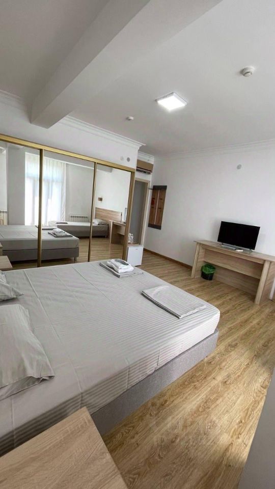 В номере: двухспальная кровать 180*200, односпальная кровать 90*200, телевизор, шкаф, мини-холодильник, кондиционер, собственная ванная комната, полотенца, утюг, фен, чайник.
