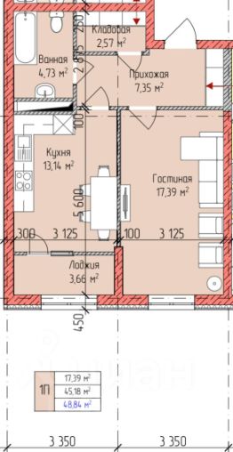 Квартира находится на 18 эт. Общая площадь 48.84 кв.м. Жилая комната 17.39 кв.м. Кухня 13.14 кв.м. Ванная 4.73 кв.м. Кладовая 2.57 кв.м. Прихожая 7.35 кв.м. В квартире заведены провода электропитания и стояки водоснабжения, вентиляции и канализации. В каждом подъезде 2 лифта. Большой надземный паркинг. Во дворе спортивная и детская площадки.
